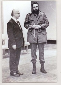 Gonzalo Rojas recibe a Fidel Castro en la Embajada de Chile en Cuba quién llega a firmar el libro de condolencias por la muerte del presidente Allende.