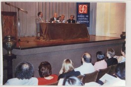 Gonzalo Rojas junto a otras personas no identificadas en una presentación de un libro, realizada en sala América de la Biblioteca Nacional de Chile.