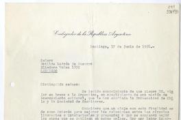 [Carta] 1958 junio 17, Santiago [a] Matilde Ladrón de Guevara, Santiago [manuscrito] Embajador de la República Argentina.