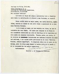 [Carta] 1960 febrero 17, Santiago de Chile [a] Señor Presidente de la Sociedad de Escritores Argentinos, Buenos Aires [manuscrito] / Matilde L. de Guevara de Arredondo. 1 hoja ; 28 cm. .
