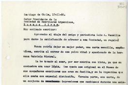 Envía de regalo una carta perteneciente a Gabriela Mistral para ser exhibida en el museo que posee la Sociedad de Escritores Argentinos.