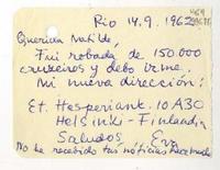 [Carta] 1962 septiembre 14, Río de Janeiro [a] Querida Matilde [manuscrito] / Eva [Vastari]. 1 hojas ; 7 x 9 cm. .