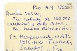 [Carta] 1962 septiembre 14, Río de Janeiro [a] Querida Matilde [manuscrito] Eva [Vastari].