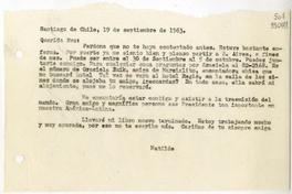 [Carta] 1963 septiembre 19, Santiago de Chile [a] Querida Eva [manuscrito] / Matilde [Ladrón de Guevara]. 1 hoja ; 15 x 22 cm. .