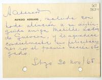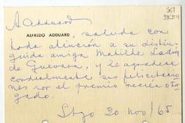 [Carta] 1965 noviembre 20, Santiago [a] Matilde Ladrón de Guevara [manuscrito] / Alfredo Adduard. 1 hoja ; 11 x 14 cm. .