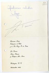 [Tarjeta] 1967 diciembre, Washington [a] Matilde Ladrón de Guevara [manuscrito] / Radomiro Tomic. 1 tarjeta ; 14 x 22 cm. plegable a 14 x 11 cm. .