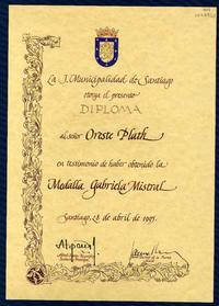 [Diploma] 1995 abril 28, Santiago, Chile [a] Oreste Plath [manuscrito] / Municipalidad de Santiago (Chile). 1 diploma ; 38,5 x 27 cm. .