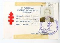 Credencial del Partido Demócrata Cristiano [manuscrito] / Partido Demócrata Cristiano (Chile). 1 carné : 8 x 11 cm. ; 1 fotografia en sepia (3 x 3 cm). .
