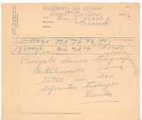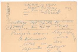 [Telegrama], 1921 mayo 13 Santiago, Chile <a> Laura Rodig, Chile [manuscrito] Gabriela Mistral.