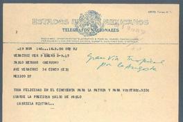 [Telegrama], 1950 ene. 9 México <a> Pablo Neruda [manuscrito] / Gabriela Mistral. 1 h. 17 x 22 cm. .