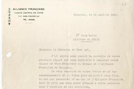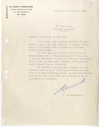 Lamenta su alejamiento de la Alianza Francesa de Shanghai y comunica el deseo que colabore con la misma en El Cairo.