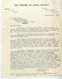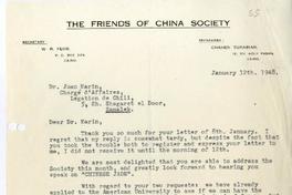 Comunica que la Sociedad de los Amigos de China espera con ansiedad escuchar sus palabras sobre "Chinese Jades".