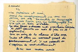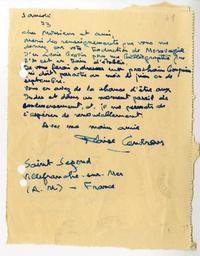 [Carta] 1949 Francia [a] Juan Marín [manuscrito] / Blaise Cendrars. 1 hoja ; 17 x 13,5 cm. .
