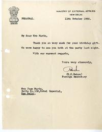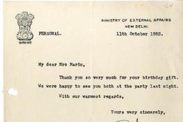 [Carta] 1952 octubre 11, New Delhi, India [a] Juan Marín [manuscrito] Jawaharlal Nehru.
