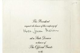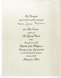 Invitación del Presidente a una cena en honor a los oficiales invitados a la Inauguración de la República de las Filipinas, en el Malacañan Palace.