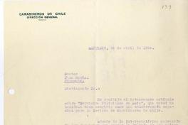 Agradece artículo enviado "Servicios policiales en Asia", a la Revista de Carabineros de Chile.