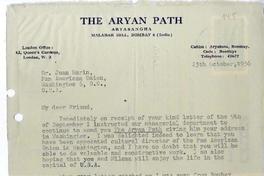 [Carta] 1956 octubre 25, Bombay, India [a] Juan Marín [manuscrito] Sophia Wadia.