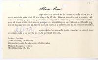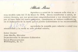 [Carta] 1958?, Colombia [a] Juan Marín [manuscrito] / Alberto Lleras Camargo. 1 hoja ; 17,5 x 10,5 cm. .