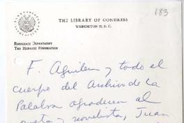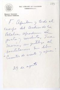 [Carta] 1963? agosto 29, Washington, D.C. [a] Juan Marín [manuscrito] / Francisco Aguilera. 1 hoja ; 20 x 13 cm. .