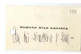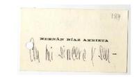 [Tarjeta] 1963, Santiago, Chile [a] Milena Luksic [manuscrito] / Hernán Díaz Arrieta. 1 hoja ; 9 x 5 cm. .