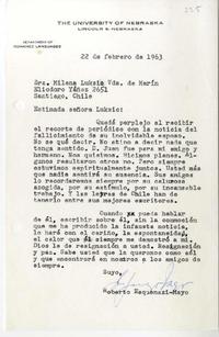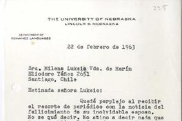 [Carta] 1963 febrero 22, Nebraska [a] Milena Luksic [manuscrito] Roberto Esquenazi-Mayo.