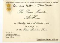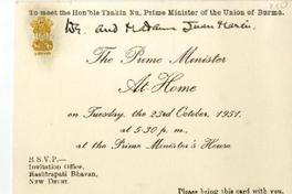 [Invitación] 1951, New Dehli, India [a] Juan Marín [manuscrito] / U Nu (Thakin Nu). 1 tarjeta ; 13 x 9,5 cm. .