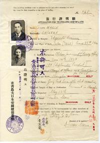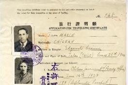Certificado de viaje N° 945 del consulado japonés para Juan Marín y su esposa Milena Luksic.