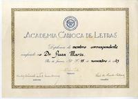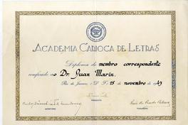 Diploma que certifica que Juan Marín es Miembro Correspondiente de la Academia de Letras.