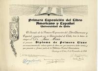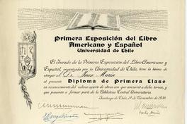 Diploma de Primera Clase en reconocimiento a Juan Marín por el valioso aporte de sus obras en la "Primera Exposición del Libro Americano y Español", que pasarán a formar parte de la Biblioteca Central Universitaria de la Universidad de Chile.