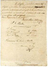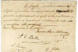 Declaración de Francisco Solano Astaburuaga donde se comprometen E. Bello, S. Lindsay, Juan Espejo, A. Pinto, Francisco de Paula Matta y Francisco Bilbao, a publicar un periódico con el nombre El Siglo.