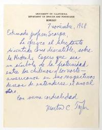 [Carta] 1968 noviembre 7, Berkeley, California [a] Roque Esteban Scarpa [manuscrito] / Martín C. Taylor. 1 hoja ; 13,8 x 10,7 cm. .