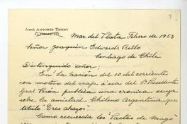 [Carta] 1953 febrero, Mar del Plata, Argentina [a] Joaquín Edwards Bello. [manuscrito] José Antonio Terry; transcrita por Amalia de Terry.