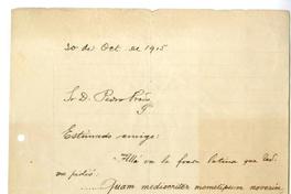 [Carta] 1915 octubre 30, Santiago, Chile [a] Pedro Prado [manuscrito] / Omer Emeth. 1 hoja ; 27 x 21 cm. .