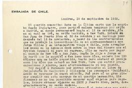 [Carta] 1950 septiembre 19, Londres, Inglaterra [a su madre] [manuscrito] / Luis Oyarzún. 1 hoja ; 24,5 x 19 cm. .