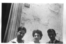 Jorge Teillier junto a Sybila Arredondo y León Ocqueteaux en la puerta de la casa de Hernán Cortés N°2839.