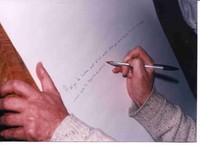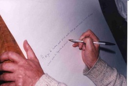 Jorge Teillier escribiendo una dedicatoria a los amigos de Lautaro.
