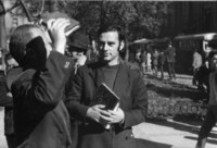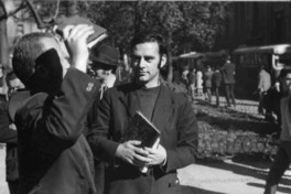 Jorge Teillier junto a un predicador evangélico en la Plaza de Armas de Santiago.