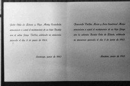 [Parte de Matrimonio] [fotografía]. Santiago, Chile : [Editor no identificado]; 1963. 1 fotografía : color, papel brillante, 9 x 12,5 cm. .