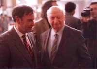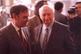 Jorge Teillier junto a Volodia Teiltelboim durante la Ceremonia del "Premio Eduardo Anguita" en la Universidad de Chile .