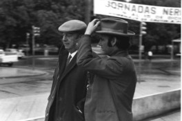 Jorge Teillier caminando junto a Pablo Neruda durante las "Jornadas Nerudianas" en Temuco.