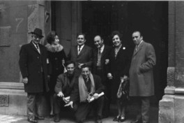 Jorge Teillier junto a Mario Ferrero, y otros poetas, en la puerta de la Sociedad de Escritores de Chile.