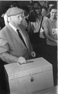 Volodia Teitelboim en la urna, durante las eleciones presidenciales en 1989.