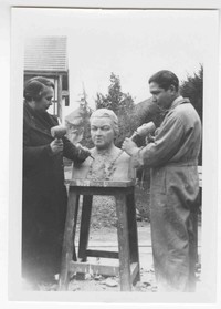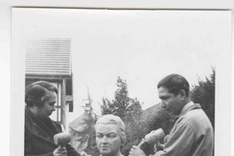 Dos artistas no identificados esculpiendo un busto de Gabriela Mistral.