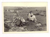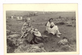 Gabriela Mistral junto a candelaria Escolá, sentada sobre una roca en medio de una llanura en México.