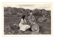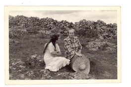Gabriela Mistral sentada sobre una roca junto a Candelaria Escolá, en medio de una llanura en México.