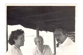 Gabriela Mistral junto a Emma Cosío Villegas y un hombre no identificado. Recostada sobre la barandilla de una embarcación que recorre el río Papaloapan en Veracruz (Veracruz).
