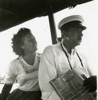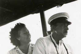 Muestra a Emma Cosío Villegas y al capitán de la embarcación que navega el río Papaloapan en Veracruz (México).