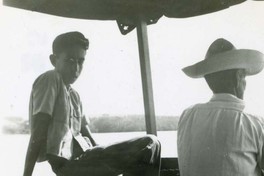 Muestra a un hombre (con sombrero y de espaldas) y un adolescente no identificados, sentados en la cubierta de la embarcación que recorre el río Papaloapan en Veracruz (México).