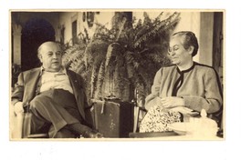 Gabriela Mistral (con lentes) junto al poeta Méxicano Alfonso Reyes sentados en la galería de la casa principal de la Hacienda El Lencero en Xalapa, Veracruz (México).