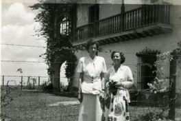 Muestra a dos mujeres no identificadas de pie en el jardín de la casa principal de la Hacienda El lencero en Xalapa, Veracruz (México).